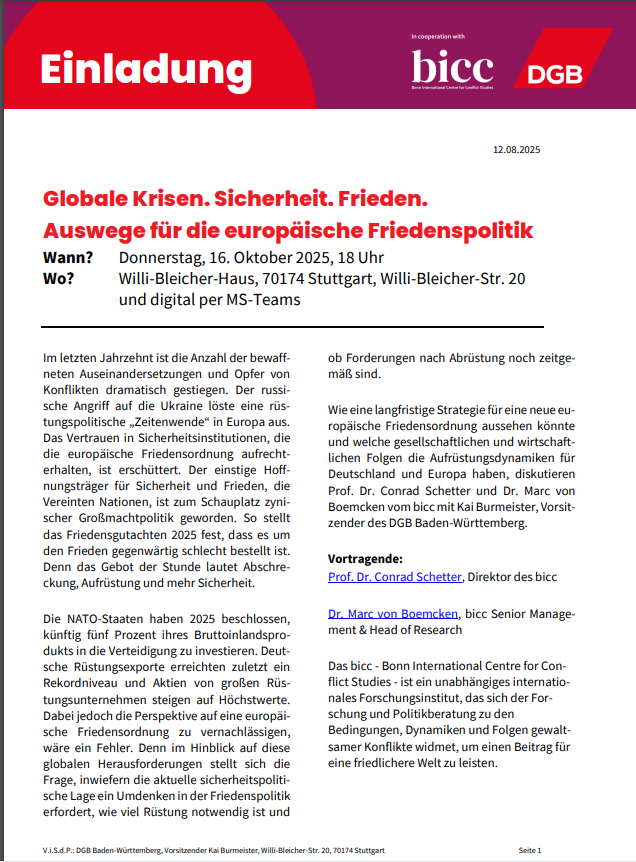Wann? Donnerstag, 16. Oktober 2025, 18 Uhr Im letzten Jahrzehnt ist die Anzahl der bewaffneten Auseinandersetzungen und Opfer von Konflikten dramatisch gestiegen. Der russische Angriff auf die Ukraine löste eine rüstungspolitische „Zeitenwende“ in Europa aus. Das Vertrauen in Sicherheitsinstitutionen, die die europäische Friedensordnung aufrechterhalten, ist erschüttert. Der einstige Hoffnungsträger für Sicherheit und Frieden, die Vereinten Nationen, ist zum Schauplatz zynischer Großmachtpolitik geworden. So stellt das Friedensgutachten 2025 fest, dass es um den Frieden gegenwärtig schlecht bestellt ist. Denn das Gebot der Stunde lautet Abschreckung, Aufrüstung und mehr Sicherheit. Die NATO-Staaten haben 2025 beschlossen, künftig fünf Prozent ihres Bruttoinlandsprodukts in die Verteidigung zu investieren. Deutsche Rüstungsexporte erreichten zuletzt ein Rekordniveau und Aktien von großen Rüstungsunternehmen steigen auf Höchstwerte. Dabei jedoch die Perspektive auf eine europäische Friedensordnung zu vernachlässigen, wäre ein Fehler. Denn im Hinblick auf diese globalen Herausforderungen stellt sich die Frage, inwiefern die aktuelle sicherheitspolitische Lage ein Umdenken in der Friedenspolitik erfordert, wie viel Rüstung notwendig ist und ob Forderungen nach Abrüstung noch zeitgemäß sind. Wie eine langfristige Strategie für eine neue europäische Friedensordnung aussehen könnte und welche gesellschaftlichen und wirtschaftlichen Folgen die Aufrüstungsdynamiken für Deutschland und Europa haben, diskutieren Prof. Dr. Conrad Schetter und Dr. Marc von Boemcken vom bicc mit Kai Burmeister, Vorsitzender des DGB Baden-Württemberg. Vortragende: Das bicc – Bonn International Centre for Conflict Studies – ist ein unabhängiges internationales Forschungsinstitut, das sich der Forschung und Politikberatung zu den Bedingungen, Dynamiken und Folgen gewaltsamer Konflikte widmet, um einen Beitrag für eine friedlichere Welt zu leisten. Sein multidisziplinärer Ansatz umfasst die Themen Das bicc wurde 1994 mit Unterstützung des Landes Nordrhein-Westfalen gegründet und ist Mitglied der Johannes-Rau-Forschungsgemeinschaft. Bonn International Centre for Conflict Studies – bicc Das Friedensgutachten ist das gemeinsame Gutachten der deutschen Friedensforschungsinstitute (bicc/IFSH/INEF/PRIF) und erscheint seit 1987. Wissenschaftlerinnen und Wissenschaftler aus verschiedenen Fachgebieten untersuchen darin internationale Konflikte aus einer friedensstrategischen Perspektive und geben klare Empfehlungen für die Politik. Startseite | friedensgutachten Anmeldung bitte unter folgendem Link: https://t1p.de/e8nya |