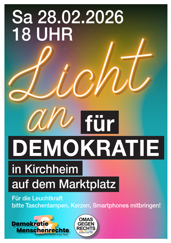 Im Blick auf die Landtagswahl laden die Kirchheimer Gruppe „Omas gegen Rechts“ und das Bündnis für Demokratie und Menschenrechte Kirchheim lm Samstag, 28. Februar 2026 um 18.00 Uhr zu einer Aktion auf dem Kirchheimer Marktplatz ein unter dem Motto „Licht an für die Demokratie“. Die etwa einstündige Aktion will ein sichtbares Licht-Zeichen für Demokratie und Menschenrechte und gegen Rechtsextremismus setzen. Sie findet zeitgleich in 20 weiteren Städten in Baden-Württemberg statt.